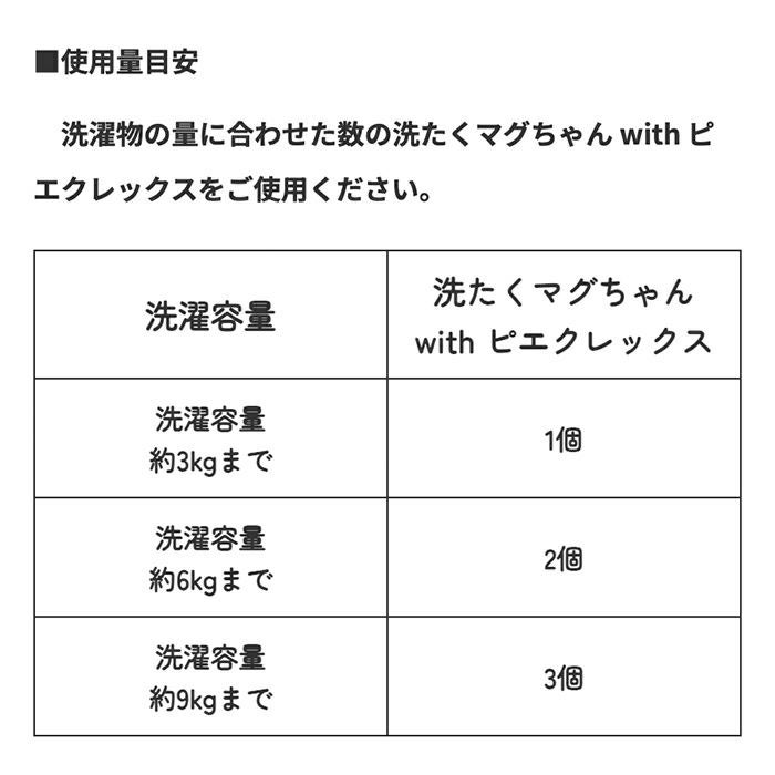 洗濯物の量に合わせた数の洗たくマグちゃん with ピエクレックスをご使用ください。